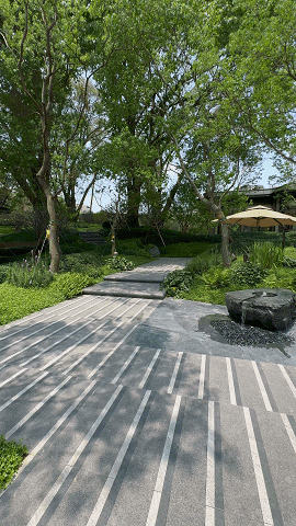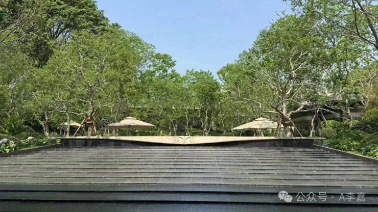 项目虽不直接临江,却巧妙借助周边生态资源,打造出“内外双园”的生态系统。西侧配建约2万方市政公园,草木葱茏、路径幽深,已部分实景呈现,隐逸感十足;社区内部则规划约330米中轴园林,以“三进五院”的中式礼序贯穿南北,绿化率约35%,形成一道天然的视觉与声音屏障。
