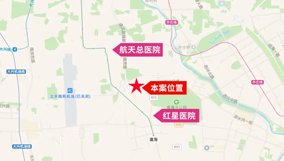 2个三甲医院:南侧3公里处为北京市大兴区中西医结合医院(原名:北京市大兴区红星医院);项目西北侧3.8公里,为航天总医院。
