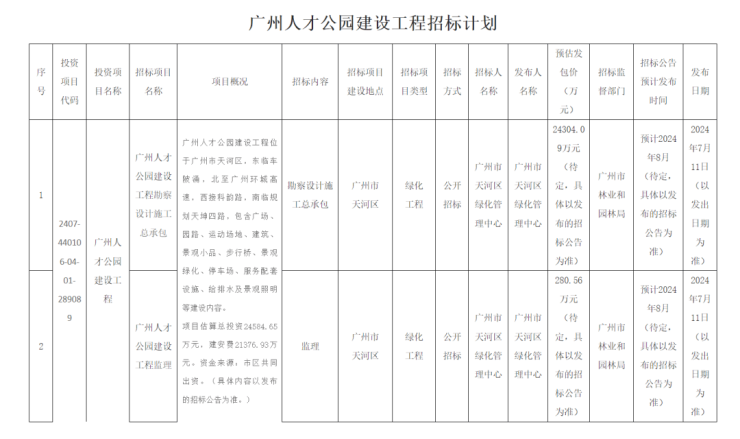 最近,广州人才公园建设招标计划公布,包括建设工程勘察设计施工总承包和建设工程监理,预计总投资2.45亿。