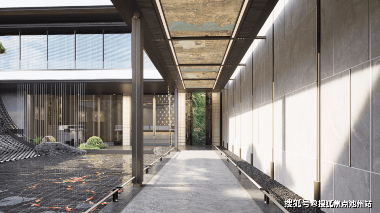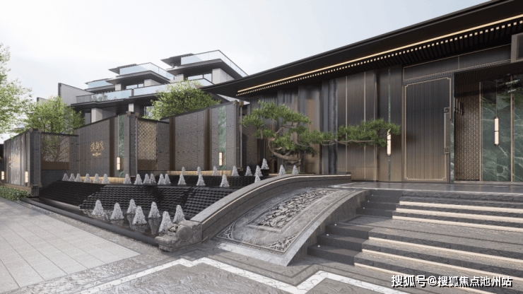 瓯越玺采用新中式建筑风格,精益求精,品质上再升级,师法乾隆花园“贵显于仪”造诣精髓,衔承古韵经纬,匠造“乾园八景”,主入口约40米宽幅门厅、尊崇庑殿顶,“普拉达绿”奢石背景墙,构筑当代中国厅堂府门;约11米宽幅迎宾台阶,桥面精雕纹样,拾级而上,尽显壕门威仪;瓦坡屋顶,风雨连廊,两侧滴水链飞流浅唱;“一池三山”、“一水四态”于水石松间跳动天地灵气,于动静间铺展东方美学意境,林泉、断虹、亭台妙境天成,从闲雅生活到山水意趣,举步间随心切换;奇石错落有致,树阵郁郁葱葱,“九曲流觞”之景,以“曲水流觞图”为蓝本,复兴“曲水宴饮”的风雅盛景;约105米中轴巷道,集萃四季如诗风景,花卉植被错落有致,景石、树木、屏风、宫灯等礼制东方雅韵,于画境中,铺陈尊崇归家礼遇。