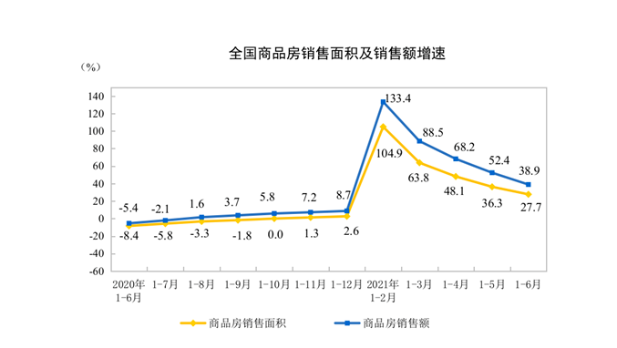 商品房销售和待售情况,1-6月份,商品房销售面积88635万平方米,同比增长27.7%;比2019年1—6月份增长17.0%,两年平均增长8.1%。其中,住宅销售面积增长29.4%,办公楼销售面积增长10.0%,商业营业用房销售面积增长5.7%。商品房销售额92931亿元,增长38.9%;比2019年1—6月份增长31.4%,两年平均增长14.7%。其中,住宅销售额增长41.9%,办公楼销售额增长10.7%,商业营业用房销售额增长8.8%。