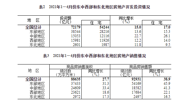 1-6月份,东部地区商品房销售面积37433万平方米,同比增长31.3%;销售额54169亿元,增长45.9%。中部地区商品房销售面积24609万平方米,增长33.4%;销售额18582亿元,增长41.3%。西部地区商品房销售面积23621万平方米,增长18.6%;销售额17684亿元,增长22.1%。东北地区商品房销售面积2972万平方米,增长17.3%;销售额2497亿元,增长16.5%。