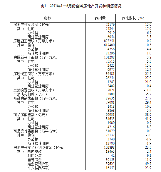 焦点财经讯 耿宸斐7月15日,国家统计局发布2021年1—6月份全国房地产开发投资和销售情况。