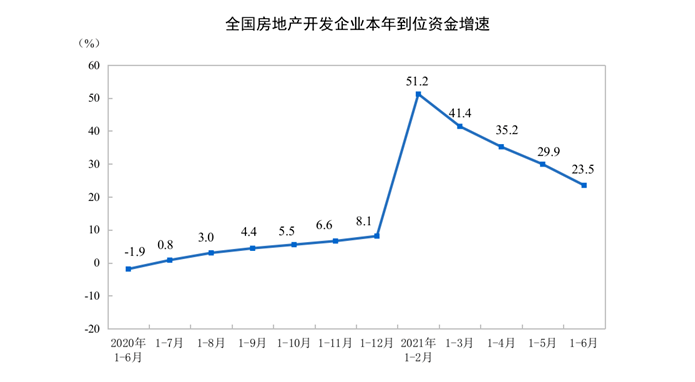 房地产开发企业到位资金情况方面,1-6月份,房地产开发企业到位资金102898亿元,同比增长23.5%;比2019年1—6月份增长21.1%,两年平均增长10.0%。其中,国内贷款13465亿元,下降2.4%;利用外资42亿元,下降9.1%;自筹资金30153亿元,增长11.9%;定金及预收款39625亿元,增长49.7%;个人按揭贷款16355亿元,增长23.9%。