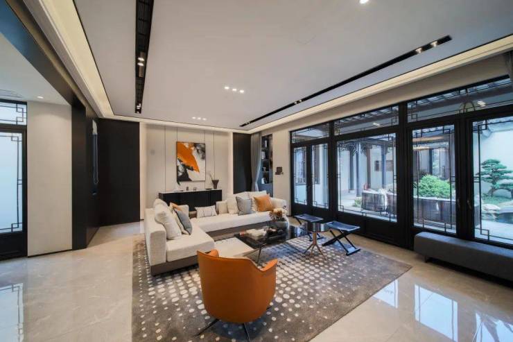 若停下脚步细细观赏,便能看到巧妙运用石材、玻璃等材质,结合博风板、滴水瓦当、将军门等经典中式元素,用心筑就意蕴诗意的一栋栋中式合院,飞檐漏窗、穿坊入巷、曲径悠长,富春御园以崭新的建筑界面,抒写东方雅仕的山水栖居情怀。