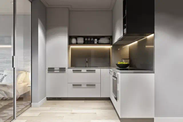 L型的厨房设计,布局管线短、经济,便于施工和水平管道的隐蔽;同时立管集中布置,节省设备空间,便于封闭;厨柜布置简单,施工误差便于调节。
