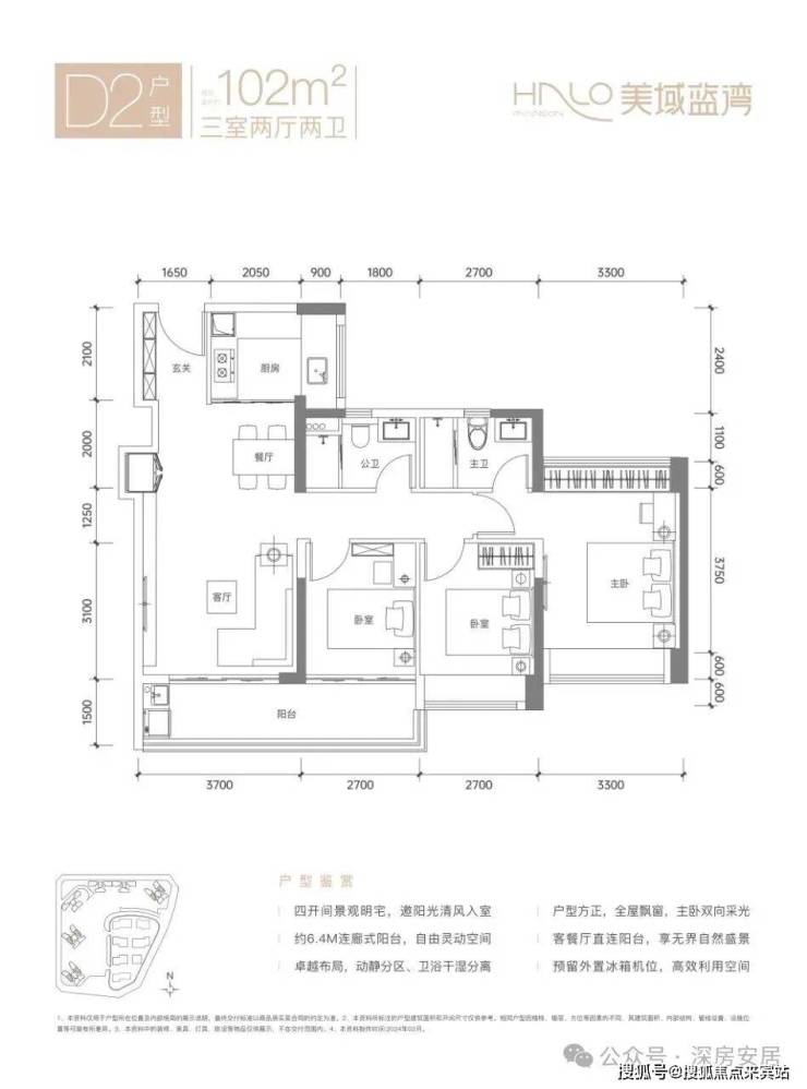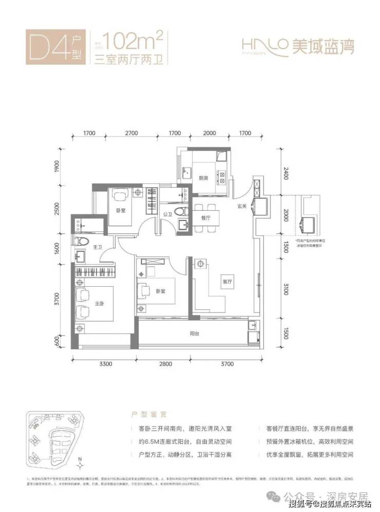 102㎡的3房2厅2卫,D2户型,设计的是竖厅南北通透格局,进门入户玄关,客厅3.7米开间,LDKB一体化设计,S墙设计预留冰箱卡槽位,动静分区,客厅连接次卧出6.4米长的观景大阳台约9.6m²,U型厨房,卫生间干湿分离,得房率约80.11%(不含赠送),西南或东北朝向。