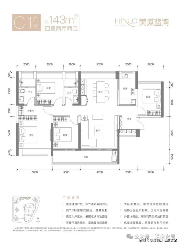 143㎡的4房2厅2卫,C1户型,设计的是竖厅南北通透格局,进门独立入户玄关,客厅4.2米开间,五开间朝南,客厅连接次卧出7.2米长的巨幕大阳台约10.8m²,U型厨房,卫生间干湿分离,得房率约77.13%(不含赠送),阳台主朝正南向,俯瞰整个小区园林景观。