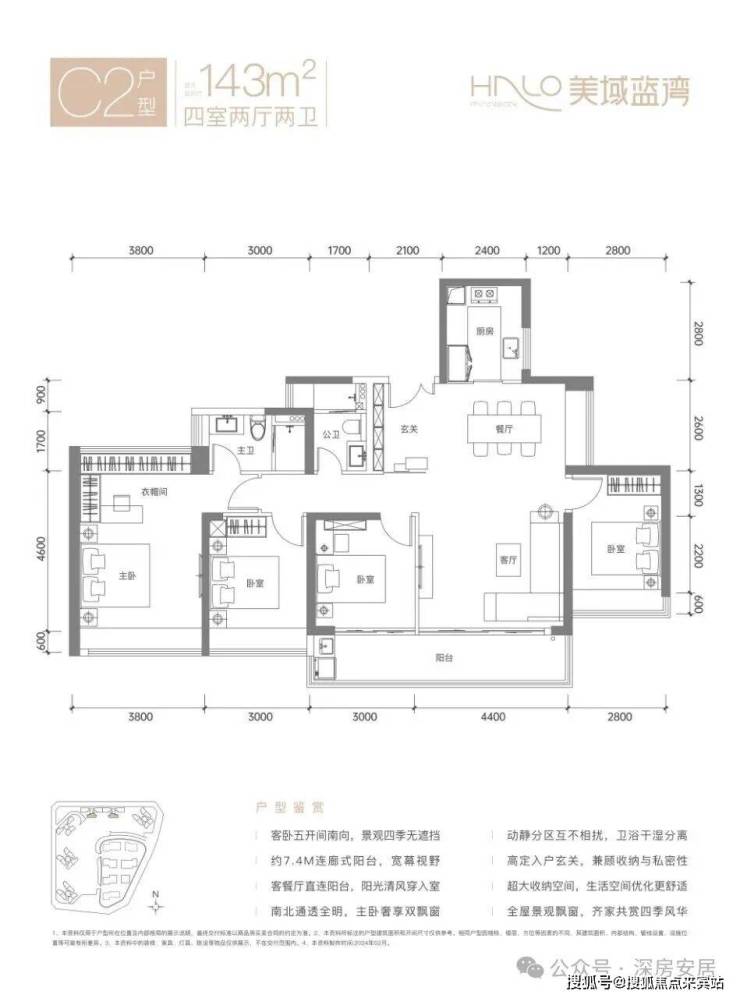 143㎡的4房2厅2卫,C2户型,设计的是竖厅双龙抱珠格局,进门入户玄关,客厅4.4米开间,LDKB一体化设计,五开间朝南,客厅连接次卧出7.4米长的巨幕大阳台约11.1m²,U型厨房,卫生间干湿分离,得房率约77.13%(不含赠送),正南朝向。