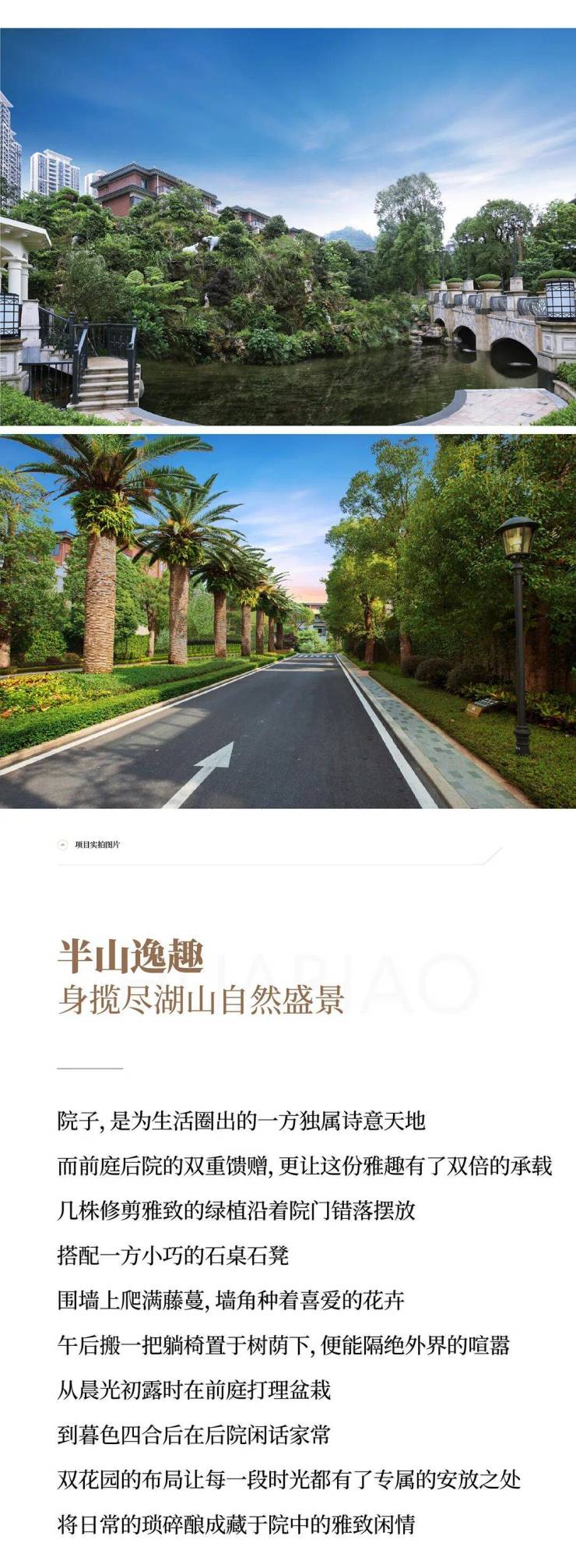 在占地面积约12.5万㎡的园林中,“石、水、光、林、云”等五大自然元素,被诗意、艺术、美学浸润。耗资过亿重金打造,栽种约400米香樟大道、非洲进口加拿列海枣名贵树种,全冠移植的十八学士白茶花,搭配多种季节性水果树名贵绿植,葱绿苍翠,鲜氧富盈。精选奢贵黄蜡石,打造活水溪流、叠水瀑布,在移步异景之中,找到久违的片刻宁静。