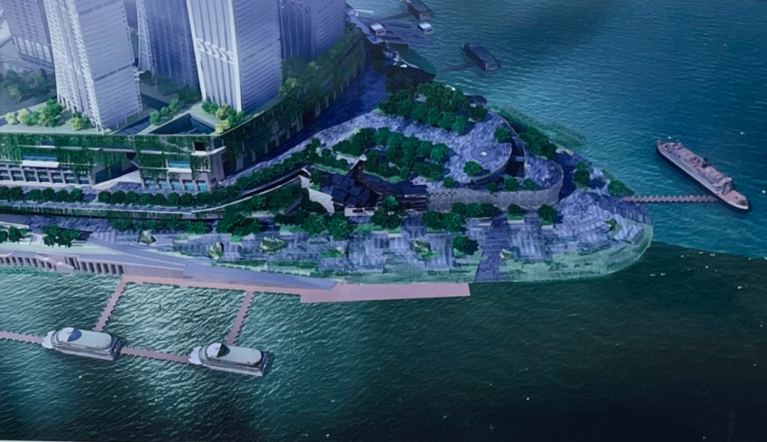 现在的项目示意图,仅是朝天门广场这一部分,整体效果,与来福士共同构成一艘扬帆的巨轮,“还绿”很突出。