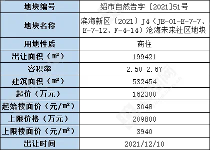 滨海新区〔2021〕J4(JB-01-E-7-7、E-7-12、F-4-14)沧海未来社区地块,出让面积199421㎡,容积率2.5-2.67,建筑面积532454㎡。