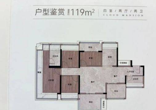 约119㎡四房:LDKG(客厅、餐厅、厨房、阳台)一体化设计,打造家族会客厅,主卧配备独立卫浴与步入式衣帽间;