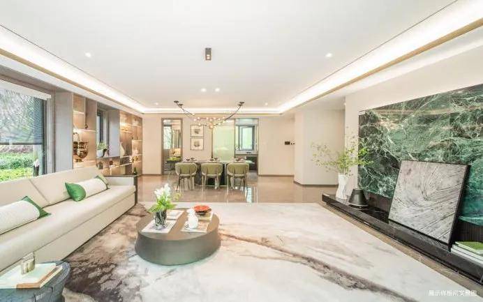 看一眼外立面,白色石材、香槟色的木纹铝板、大面积玻璃的拼接组合,怎么看都不像一个门槛只有400万+的低密叠墅。玉琮水景、山石跌水等等融入景观的大量良渚文明元素,弥漫着专属于杭州的千年气韵。满眼的“越级感”再配上只有1.2的超低容积率,最终才呈现出一座全低密真双叠大盘的样子。