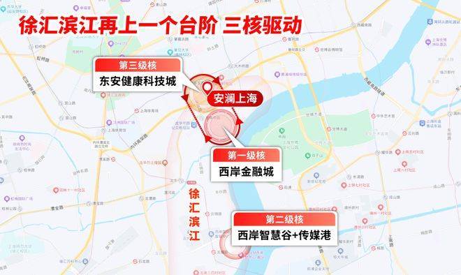 徐汇滨江产业带:西岸金融城(金融产业)、西岸智慧谷(人工智能)、东安健康科技城(生物医药)形成“三核驱动”。安澜上海向南1公里直抵西岸金融城,向东0.8公里接驳东安健康科技城,成为产业红利的“第一接收点”。