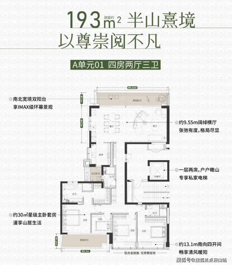项目全是南北通透的设计,每个卧室都有一个大飘窗,基本是开间有多宽,窗就有多宽。该户型属于改善群体的顶级需求,专梯入户四房三房大户型三阳台,最长那个有8.65米,餐客厅开间9.55米