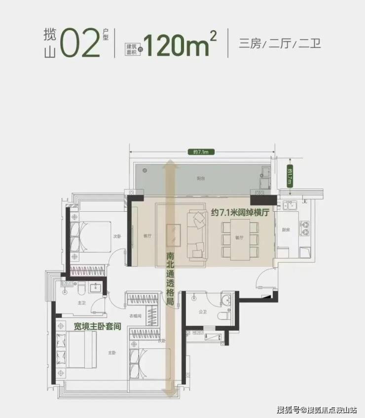01/02户型 约120㎡3房2卫横厅:客厅阳台超7.1米,尺度很大,看向小区园林以及塘朗山山景,动静分离,户型方正视野开阔,属于居住体验非常阔绰的房型。约120平房源的北向视野,从2层开始就是满目的郁郁葱葱,20层以上俯瞰整个塘朗山,东南向视野更是集山景与繁华城市于一身。