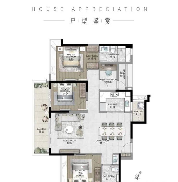 南向景观阳台 + 满飘窗,约4m南向主景观阳台,所有房间带飘窗