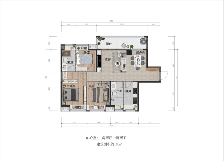 100㎡;三房两厅两卫
