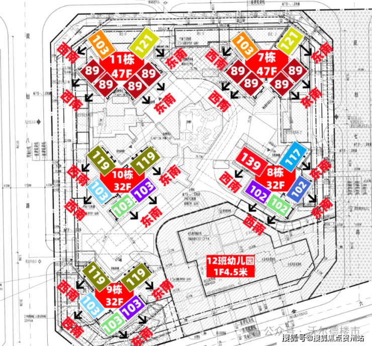 住宅为建面约89-128㎡带装修3-4房,整个社区建面约31.8万㎡,分为东西两个地块开发,由9栋高层及超高层、1栋12班幼儿园、约4700㎡商业街组成。