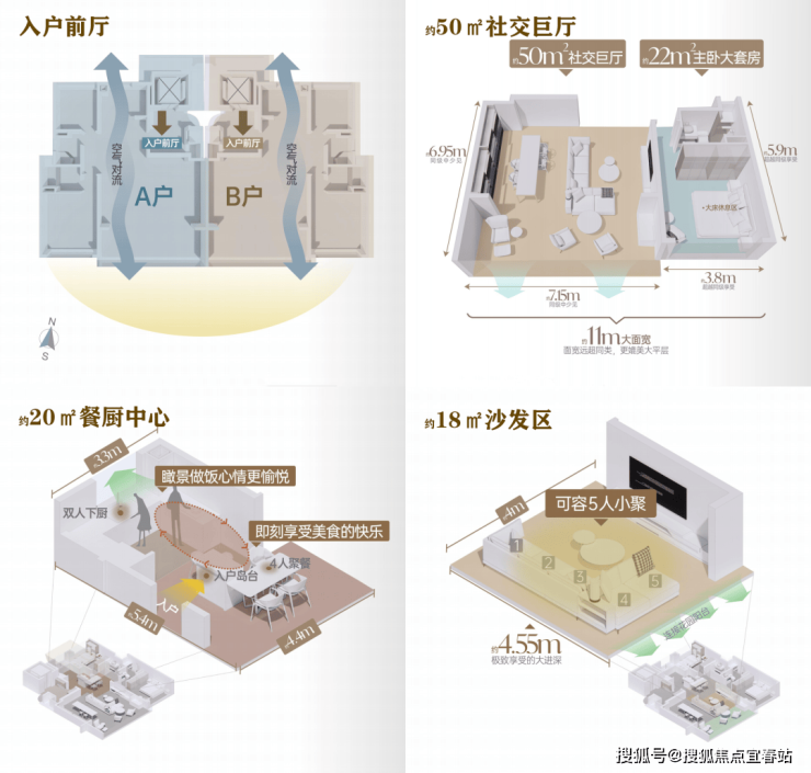 餐客厅一体化设计动线流畅,加上市面上相近户型少有的面宽约5.8m超阔横厅,将空间感无限放大。