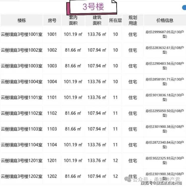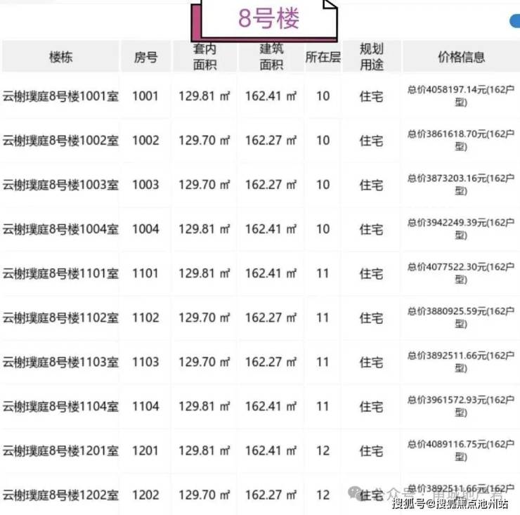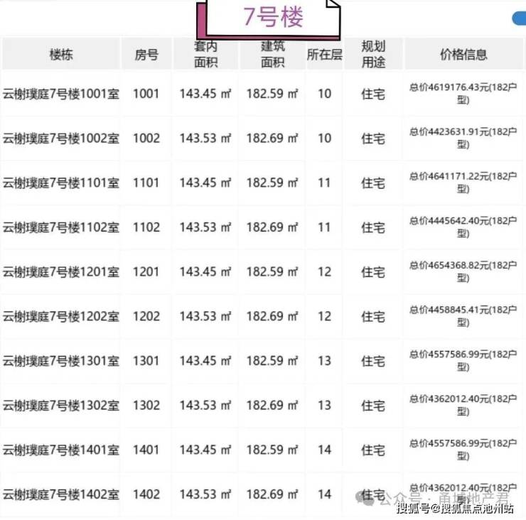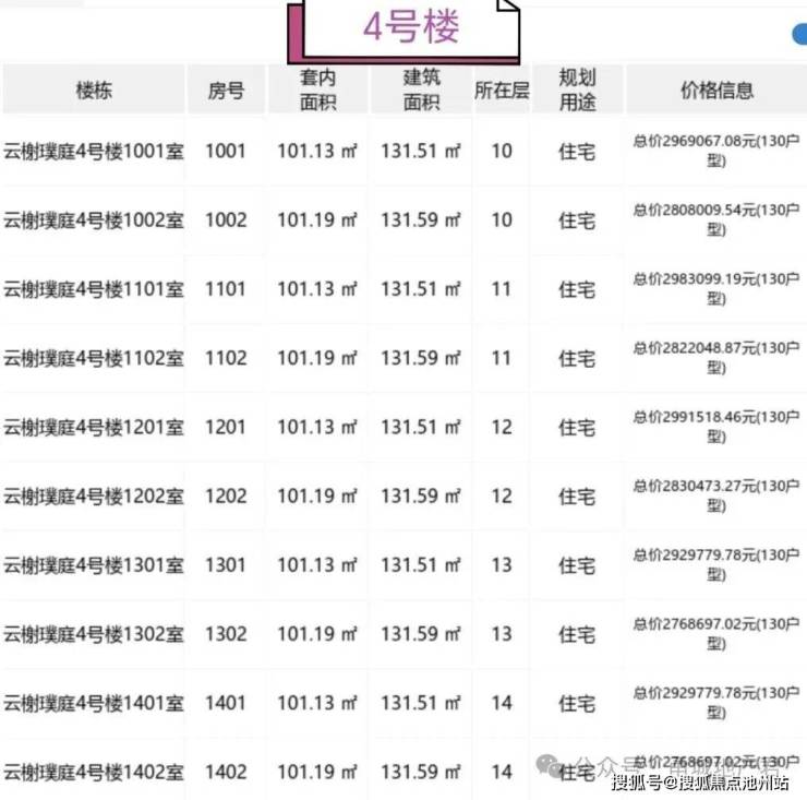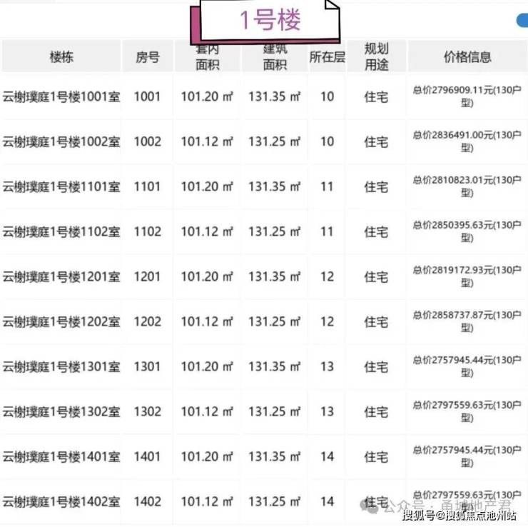 由于房源过多,仅展示各楼栋10层以上部分房源的一房一价表。