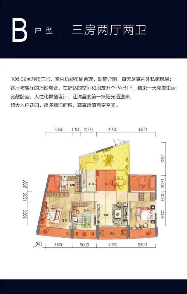 106.02㎡宽敞三居,室内功能区分明确,动静分明,每天独享内外私家风景。客厅与餐厅融汇相通,在舒适的空间内开个PARTY,尽显主人心境;宽奢卧室,人性化飘窗设计,让清晨的第一抹阳光洒进来;超大入户花园,超多赠送面积,尊享超值百变空间。