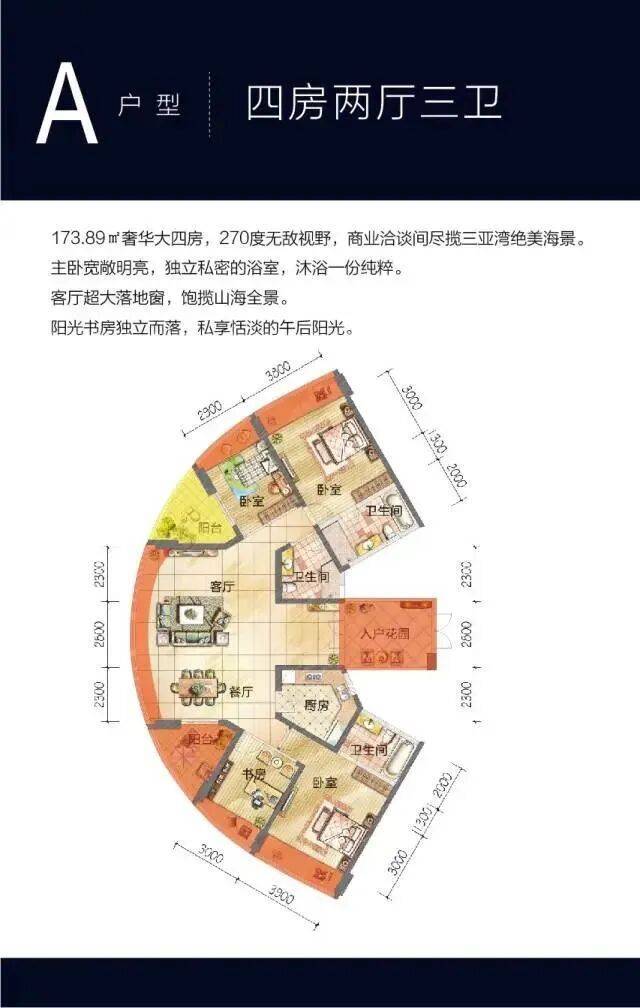 173.89㎡奢华大四房,270度无敌视野,商业洽谈间尽揽三亚湾绝美海景。主卧宽敞明亮,独立私密的浴室,沐浴一份纯粹。客厅、餐厅、景观阳台三位一体,既可与家人品味佳肴,又可邀约朋友高端人士欢聚一堂。