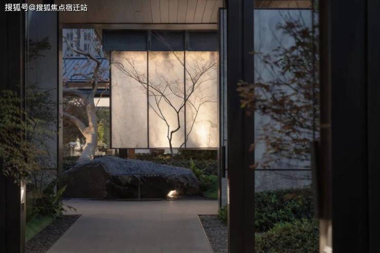 行至院落,忽闻清音袅袅,循声而入,绿意浓浓,精致窗门下感受幽雅的渗透空间。运用夹景的手法,左右两侧景墙加以屏障,使景观空间延伸至景观焦点,一树、一石、一光,叶疏影秀,小中见大。