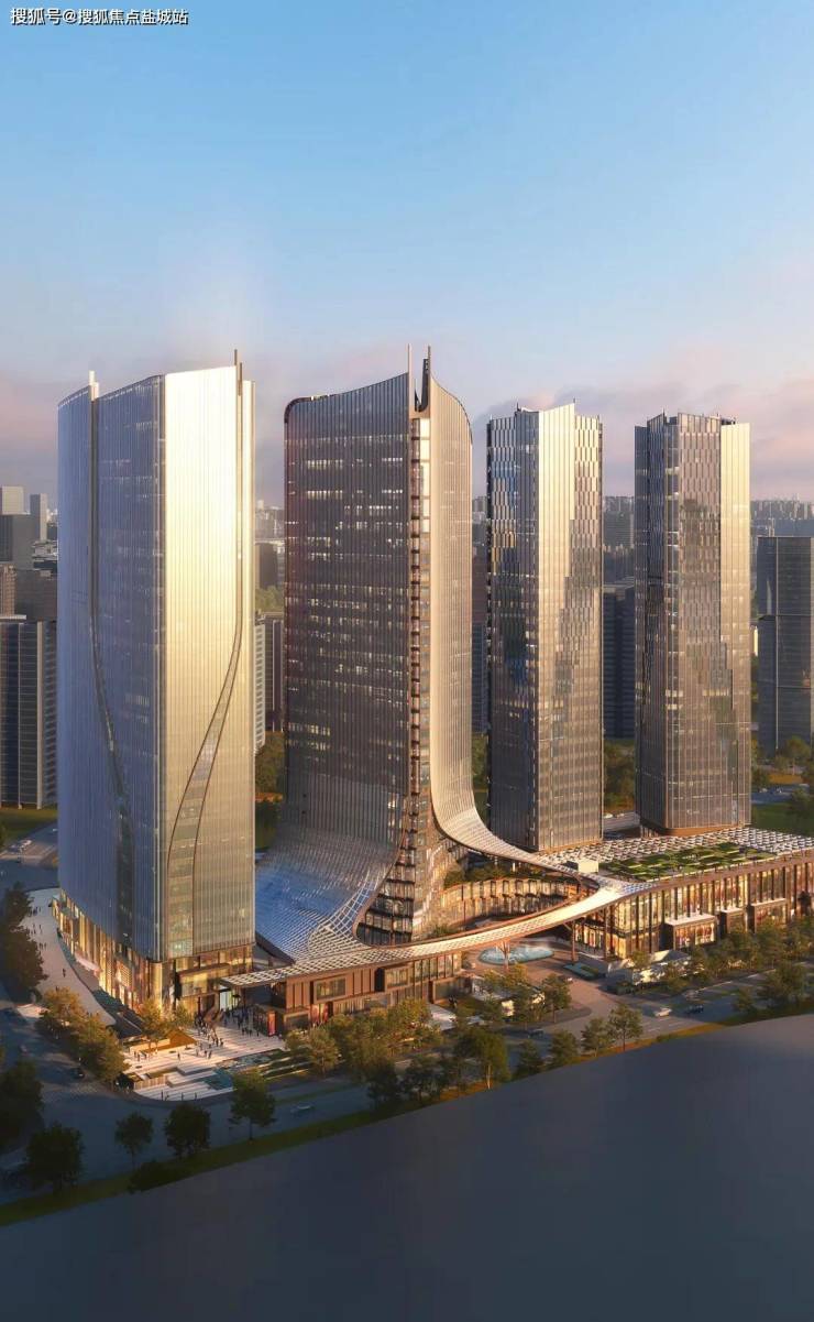 整个建筑群的布局沿着奔竞大道展开,由四栋塔楼和附属的酒店配套裙房共同组成。这个 26 万平方米的综合体项目,由七位行业大师联袂打造,其设计的核心理念是将国际化大师的智慧结晶、艺术性生活表达和杭州本土文化的融合,创新出一个独一无二的“城市会客厅”。