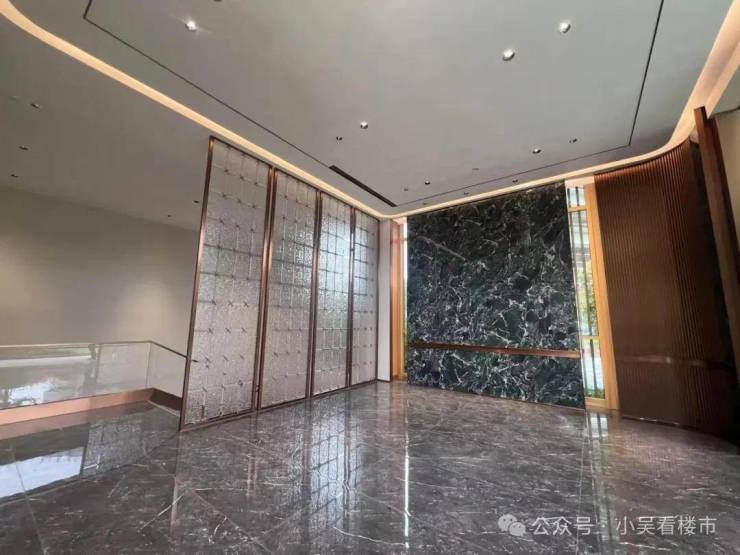 从大门进去后,是抬高式设计,二楼中转处也做了奢石的背景墙,铺了地砖,墙壁有金属条装饰。