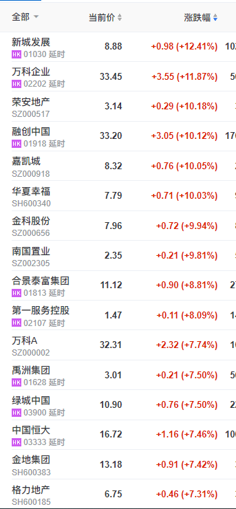 地产股早盘全线拉升 万科、保利、新城控股等涨停