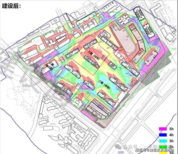 整个项目呈现出北低、南高的建筑趋势,这对于采光会有一些影响,结合项目光照分析图也能看到,2小时内日照的颜色分布范围还是比较多的。