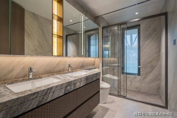 自己住在大套房,景观飘窗+步入式衣帽间+化妆间+独立卫浴,完备的主卧系统,尊贵感不言而喻。独立双台盆的设计,让晨起洗漱更加从容;
