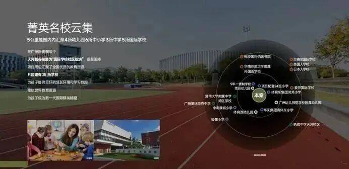 项目自配:15班幼儿园和24班小学,其中24班小学引进#广州天河外国语教育集团 合作办学,#广州天河外国语学校 自2012年4月创办以来, 学校迅速成长为广州优质教育品牌;同时享有北京大学大学先修课程实施学校、广州市教育工作先进集体等多项称号。