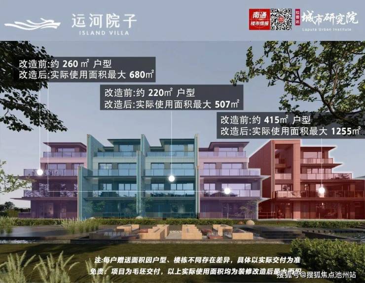 其中,运河院子建面约415㎡户型,实际使用面积最大达约1255㎡。(注:每户赠送面积因户型、楼栋不同存在差异,具体以实际交付为准。)