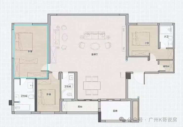 133㎡大平层,四叶草+横厅设计在广州独一无二,客厅甚至不需要打通,就能实现约7.4米大宽厅,媲美170㎡大平层。