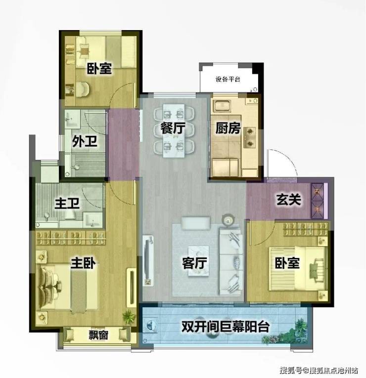 整个户型南向都是采光面,客厅连接南向约6米(轴线距离)的双阳台,引大片阳光入室,景观视野开阔。