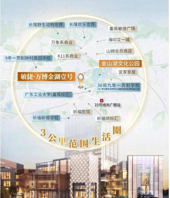 敏捷万博金湖壹号以“家门口繁华+3公里核心商圈”的双重布局,打造一站式品质生活圈,无需远行即可解锁万象繁华,完美适配现代家庭的多元消费需求。项目1公里范围内,汇聚约43万㎡祈福缤纷世界、超2万㎡宜家家居,涵盖购物、餐饮、娱乐、休闲等多元业态,日常买菜、逛街、亲子娱乐均可轻松实现,满足高频次便民消费需求。3公里范围内,坐拥万达广场、天河城、四海城等成熟商业体,还有建设中的华润万象系、待开业的K11等高端商业配套,未来将进一步提升商圈能级,从日常便民消费到高端宴请、潮流购物,全方位满足业主的多样化需求。同时,项目紧邻长隆旅游度假区,直线距离约2.5千米,一脚油门即可抵达长隆欢乐世界、香江野生动物园等景点,为家庭亲子时光增添更多乐趣,实现“繁华与休闲共生”的理想生活。