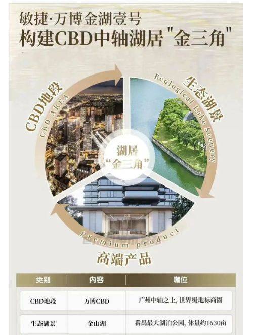 敏捷万博金湖壹号坐落于番禺万博CBD3.0时代核心,占据万博、祈福、钟村三区交汇枢纽,是万博CBD中轴线上稀缺的湖居住宅,被誉为万博版“香蜜湖”,独揽主城不可复制的地段与生态双重红利。随着万博CBD从1.5平方公里扩容至7.2平方公里,正式迈入以金山湖为核心的3.0时代,这里汇聚总部云集的世界级商圈、国内TOP4长隆主题乐园及千亩中央公园级生态资源,成为广州南进战略的核心承载地。项目择址金山湖畔,直线距离仅约400米,依托这一番禺最大湖泊公园,打造城市级湖居作品,既享受万博CBD的千亿级产业红利,又坐拥不可再生的湖景生态资源,填补了万博CBD湖居市场的空白。相较于万博核心区的高密度住宅,项目以低密属性脱颖而出,成为追求繁华与静谧平衡的改善人群首选,地段稀缺性与长期保值增值潜力凸显。