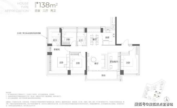 138㎡的4房2厅2卫设计的是竖厅南北通透格局,专梯入户,客厅6.1米开间,LDKB一体化,全屋飘窗,4个卧室分别做到了3.9米/3.25米/2.9米/2.8米的宽度,主卧加1个次卧270°全景飘窗,客厅出6.1米长的大阳台,U型厨房,得房率约85-95%(包含赠送),阳台主朝西南向。