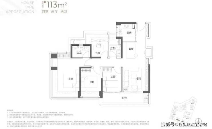 113㎡的4房2厅2卫设计的是横厅南北通透格局,客餐厅6米开间,LDKB一体化,全屋飘窗,4个卧室分别做到了3.9米/3米/2.8米/2.6米的宽度,主卧加1个次卧270°全景飘窗,客厅出6米长的大阳台,L型厨房,得房率约85-95%(包含赠送),西南或东南朝向。