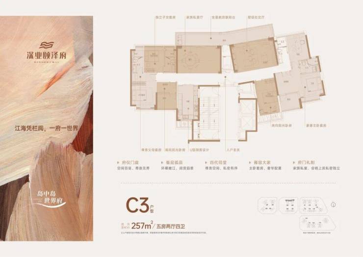 岛中岛唯此257㎡瞰江云端平墅,打造尊崇两梯两户设计,由外至内的礼序空间铺陈;室内空间百变,尊崇无界,超前适配居者需求,用前瞻性设计思维,叠加了大平层+别墅的功能,多重空间集于一层,以府门家族礼制匠造生活空间,全部楼层19F及以上,全景舱瞰江大阳台,俯瞰CBD一线江景与繁华地标;独创性用入户玄关连接两个独立空间,客餐厅创新分区、中西双厨设计,是四代同堂的完美生活,每一席皆传世孤品。