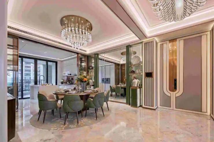 ✨过厅背景墙采用青绿哑光烤漆圆弧造型搭配绿翡翠岩板;