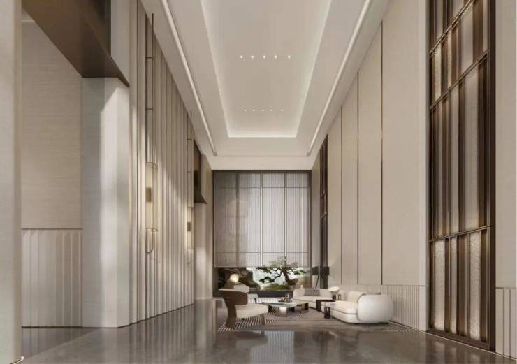 约8-10米挑高大堂,以天然的石材搭配金属线条,再配上细腻肌理的墙面、繁复的地面拼花,尽显美学艺术。