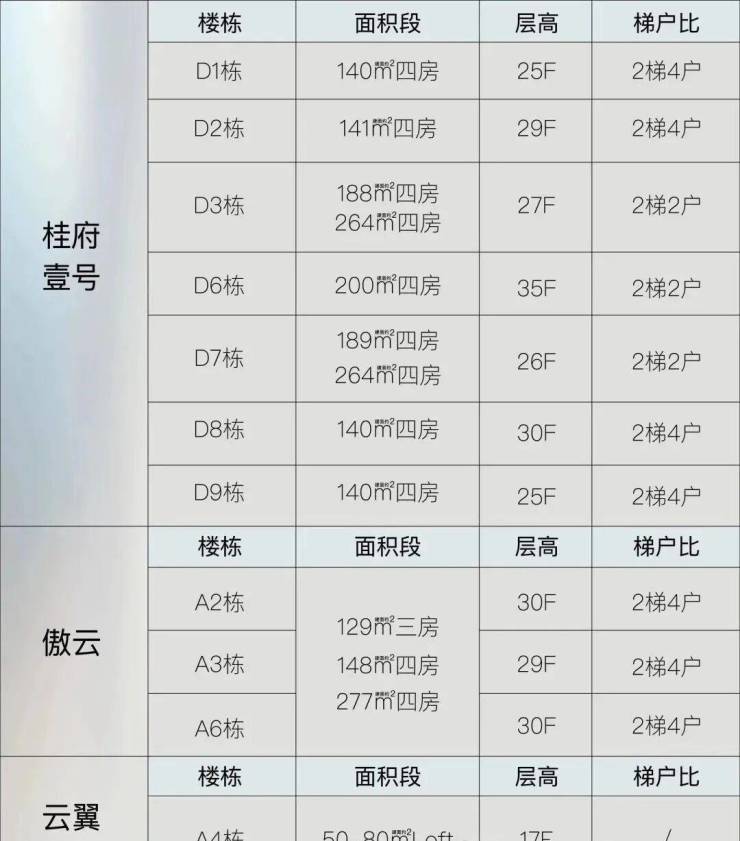 住宅部分 桂府壹号呈 围合式布局 ,9栋 (D1~D9) 25层~35层, 建面约140-264m²现代美学大平层。