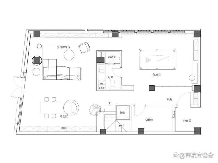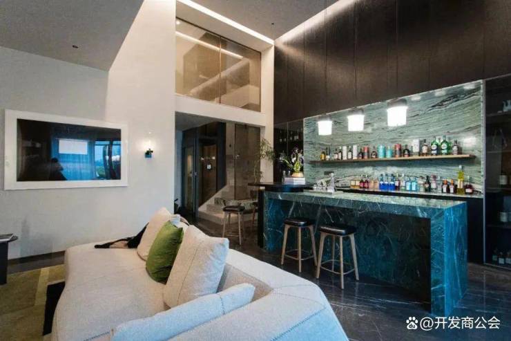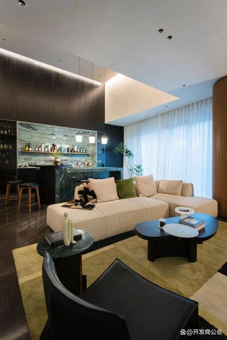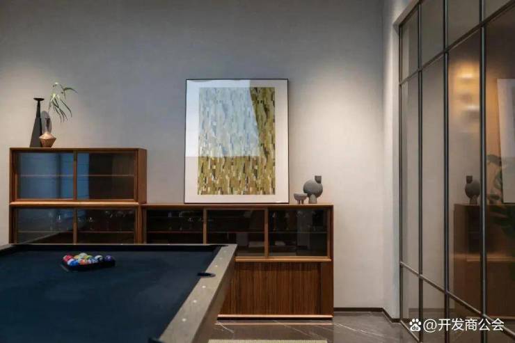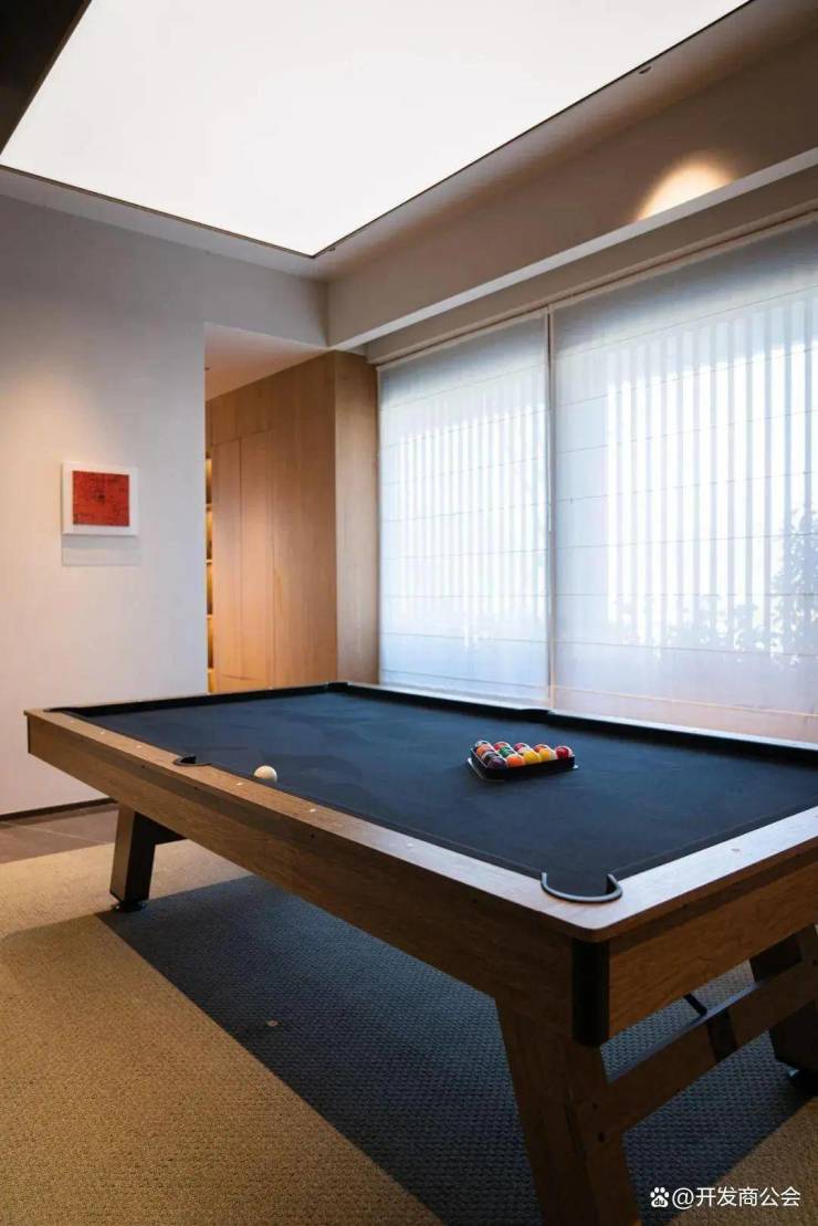 负一层设置影音室、台球休闲区、吧台区,采光通风良好,为日常休闲娱乐社交场所。