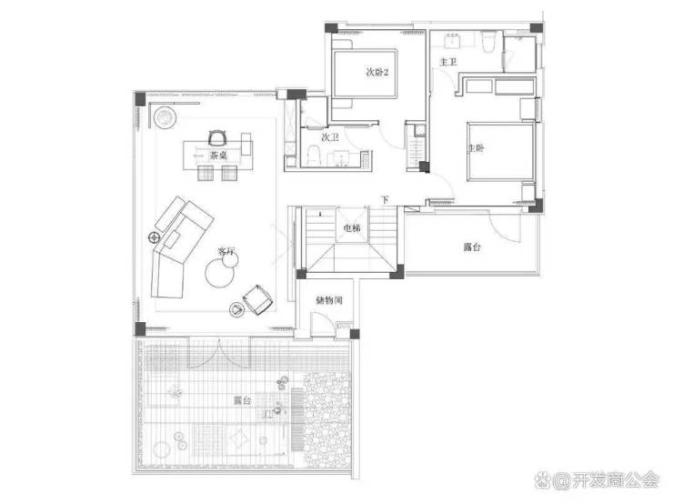 二层设置客厅、茶室,两间卧室,其中每间卧室设置独立卫生间,其中一间卧室享有超大面积露台。