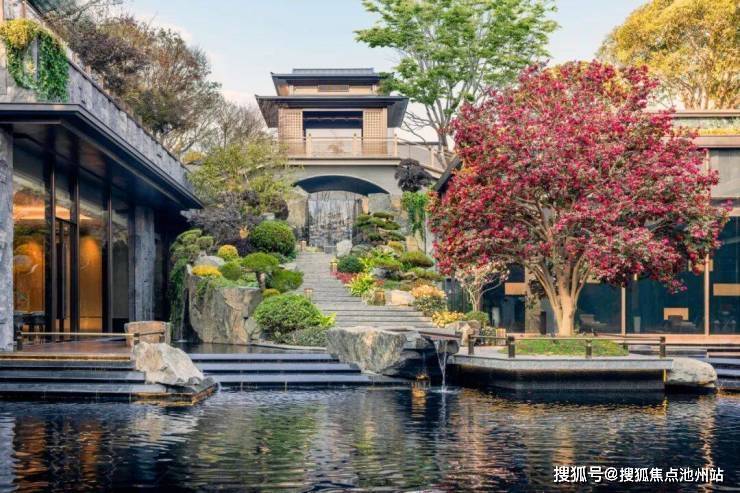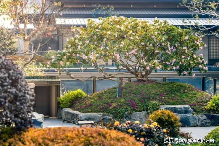 再走进示范区景观,在景观大师宋淑华笔下,仿佛来到了西湖郭庄,园中藏园,湖中有湖,水景中庭和超大落地玻璃,框住了肆意点缀的各种百年名木: