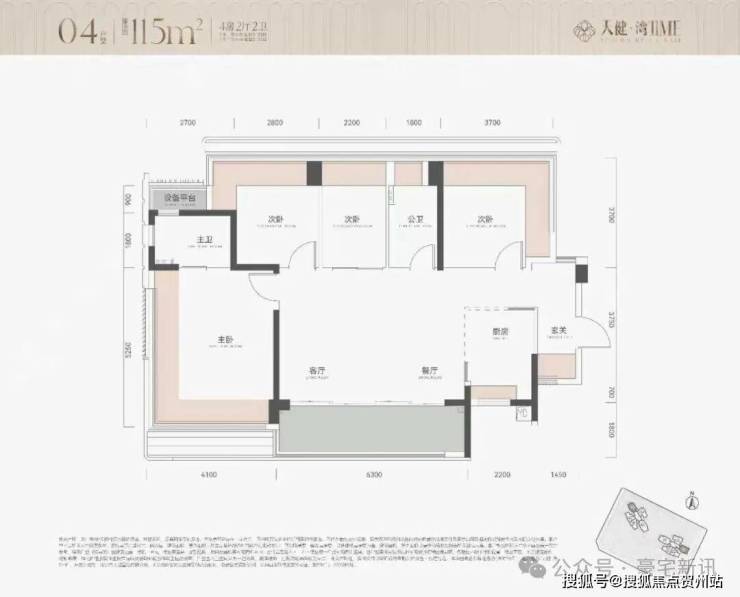 这个就是05的户型图,114平4房,传统动静分离竖厅户型,厅出大阳台,延伸到次卧,主卧和其中一个次卧双面飘窗采光,加上厨房外的设备平台,赠送面积大。